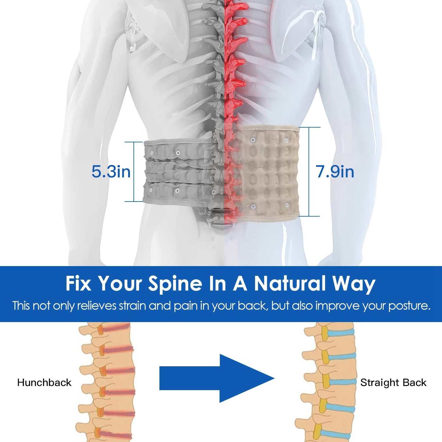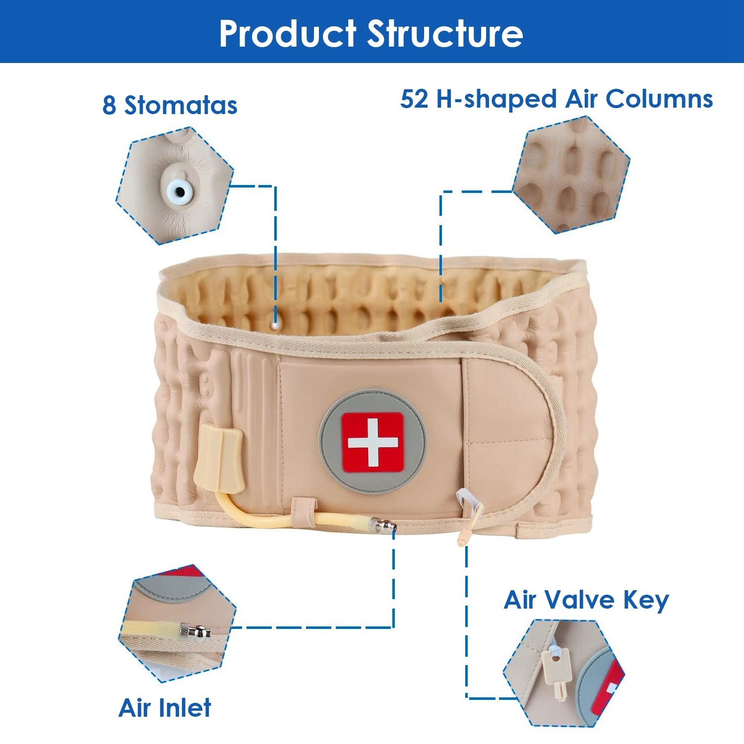 *Powerful Lumbar Support*:Adopting reverse C-thrust principle and .2MPa air pressure,our decompression back belt holds your midsection together to provide strong support and stabilization for the lower back. After inflating with air,the belt stretches and supports the lumbar spine with the 52 H-shaped air columns and 8 stomatas. This not only relieves strain and pain in your back,but it also improves your posture.
