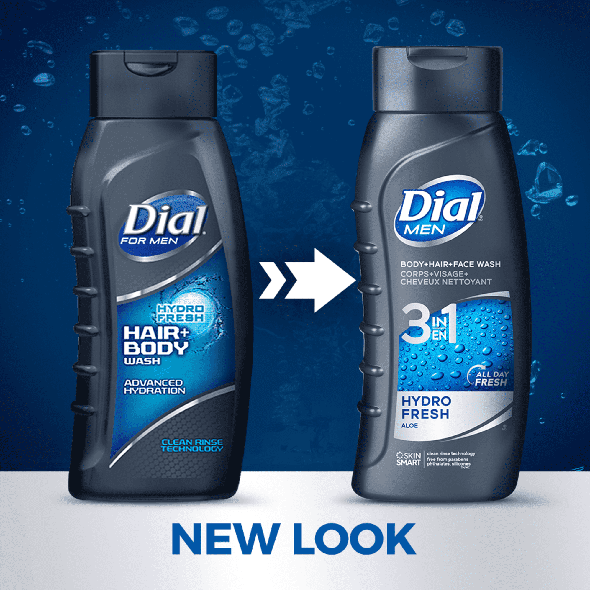 Start your day with the no-nonsense clean of Dial Men Hydro Fresh 3in1 Body, Hair and Face Wash. The convenience of shampoo, body and face wash in one handy bottle, engineered for an all-in-one solution. With its clean rinse technology and rich, creamy lather, you know you’ll be all-day fresh. Dial Men Skin Smart formulas are made to be free from parabens, phthalates and silicones, leaving skin looking and feeling hydrated and healthy. With a recyclable bottle you can feel good about, and an aloe scent that will leave you feeling fresh all day. Formulated with Clean Rinse Technology for a clean shower feel that rinses away clean without a filmy residue.