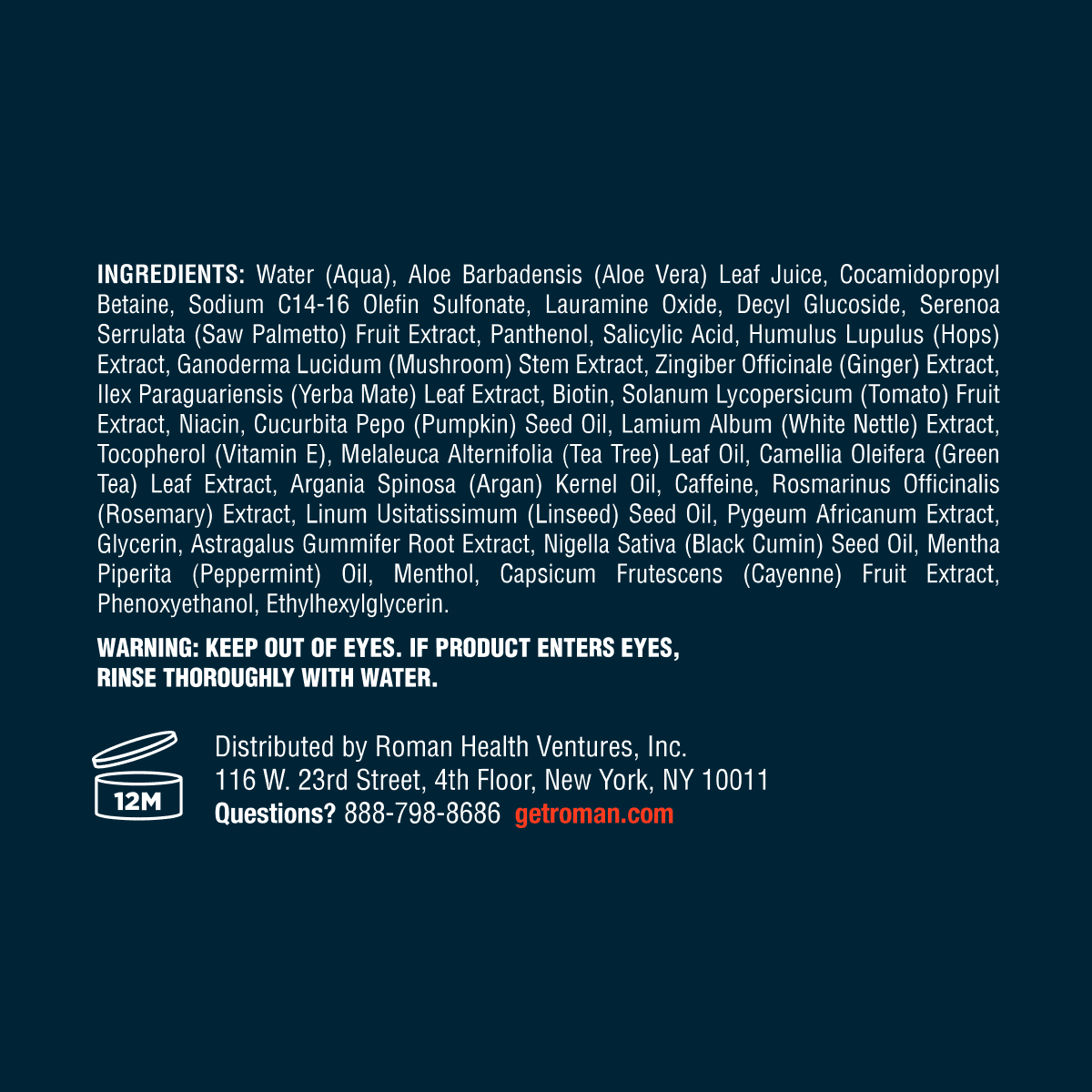 Get your head in the game. Roman Revive and Clarifying Shampoo's unique formula, enriched with saw palmetto, pumpkin seed oil, and caffeine, gently cleanses the scalp for thicker-looking hair. This shampoo was developed with men’s hair needs in mind and to help them get a head start on hair health. As the shampoo cleans, the ingredients work to exfoliate and clarify the scalp, leaving you feeling reinvigorated, refreshed, and ready to take on the day (or night!). Add this shampoo for men to your daily shower routine to cleanse for fuller-looking hair. Plus, there are no sulfates or parabens, so you can feel as good as your hair looks. The Healthcare You Deserve. Roman, a digital health clinic for men, provides accessible and high-quality healthcare. Roman offers scientifically backed men's health products, personalized treatment plans, discreet delivery, and ongoing care. From sexual health to hair loss to skincare, if something is bothering you—let's take care of it.